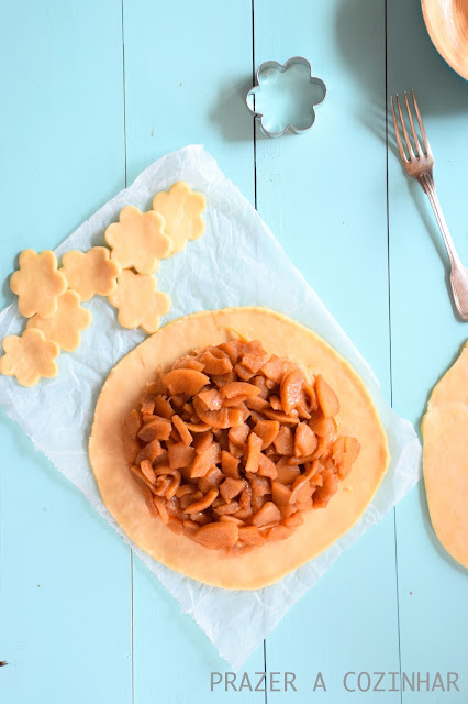 5 - Quando tudo estiver frio colocar o leite condensado sobre os círculos, deixando uma margem nas pontas e por cima colocar as maçãs. Colocar os restantes círculos de massa por cima e com um garfo pressionar as bordas. (Sobrou-me massa pelo que coloquei umas flores sobre as tartes)